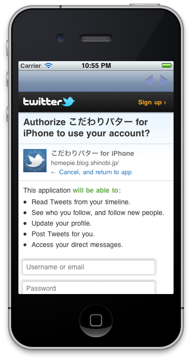 今回はUITableViewControllerの派生(既定ではRootViewController)上で実装していくことになります。 まずは、ビュー作成完了時(viewDidLoadメソッド)で、GTMOAuthAuthenticationを生成します。 GTMOAuthAuthenticationクラスの initWithSignatureMethod:consumerKey:privateKey: メソッドで初期化を行いますが、最初の引数は署名方式を指定します。Twitterの場合は現時点で「HMAC-SHA1」という方式のみをサポートしているので、「kGTMOAuthSignatureMethodHMAC_SHA1」を指定しなければいけません。 第2引数と第3引数にはそれぞれconsumerKey(コンシューマキー)とconsumerSecret(コンシューマシークレット)を指定しますが、ここにはクライアントアプリの登録時に取得されたものを指定してください。 - (void)viewDidLoad { [super viewDidLoad]; // GTMOAuthAuthenticationインスタンス生成 // ※自分の登録アプリの Consumer Key と Consumer Secret に書き換えてください NSString *consumerKey = @"XXXXXXXXXXXXXXXXXXXX"; NSString *consumerSecret = @"XXXXXXXXXXXXXXXXXXXXXXXXXXXXXXXXXXXXXXXXXX"; auth_ = [[GTMOAuthAuthentication alloc] initWithSignatureMethod:kGTMOAuthSignatureMethodHMAC_SHA1 consumerKey:consumerKey privateKey:consumerSecret]; // 認証処理を実行 [self signIn]; } 続いて認証処理を行います。ここは後のことを考えて singIn というメソッドで定義してあります。 OAuth認証を行ってくれるのはGTMOAuthViewControllerTouchなので、そのオブジェクトを生成して初期化し、pushViewController:animated: で表示します。 初期化時に指定するscopeとlanguageとはTwitterでは使用されないので、それぞれnilを指定しておきます。 OAuth認証処理が終了したときに呼び出すメソッドを、delegateおよびfinishedSelecter(セレクタ)で指定することができるので、現在のビューコントローラ(RootViewController)に authViewContoller:finishWithAuth:error: というメソッドを定義して、それを渡すようにしておきます。 アプリ登録時にも説明したように、Callback URLは使わないのですが、指定しておかないと正常に実行されないため、ダミーのURLをcallbackプロパティで指定しておきます。 // 認証処理開始 - (void)signIn { NSURL *requestTokenURL = [NSURL URLWithString:@"https://api.twitter.com/oauth/request_token"]; NSURL *accessTokenURL = [NSURL URLWithString:@"https://api.twitter.com/oauth/access_token"]; NSURL *authorizeURL = [NSURL URLWithString:@"https://api.twitter.com/oauth/authorize"]; NSString* keychainAppServiceName = @"KodawariButter"; auth_.serviceProvider = @"Twitter"; auth_.callback = @"http://www.example.com/OAuthCallback"; GTMOAuthViewControllerTouch *viewController; viewController = [[[GTMOAuthViewControllerTouch alloc] initWithScope:nil language:nil requestTokenURL:requestTokenURL authorizeTokenURL:authorizeURL accessTokenURL:accessTokenURL authentication:auth_ appServiceName:keychainAppServiceName delegate:self finishedSelector:@selector(authViewContoller:finishWithAuth:error:)] autorelease]; [[self navigationController] pushViewController:viewController animated:YES]; } ・・・一部、1行があまりにも長くなってるところがあるのは気にしない。 ところで、GTMOAuthライブラリではいったん認証が完了するとアクセストークンなどの認証情報をOSが持つKeyChainと呼ばれるパスワード管理システムに登録するようになっています。上記のコードのkeychainAppServiceNameには、KeyChainに登録する際のキーとなるサービス名を指定します。ここではアプリ名をそのままサービス名として指定しています。 2回目以降の起動時にKeyChainの情報を使うようにする方法は後述します。 次に、認証処理が完了したら authViewContoller:finishWithAuth:error: が呼ばれるようにしたので、その定義をします。 ユーザがキャンセルしたり接続エラーが発生したりなどにより認証処理が失敗すると、errorがnil以外になっています。 今回はAlertViewを表示して失敗を知らせています。なので、RootViewControllerはUIAlertViewDelegateを採用するようヘッダファイルを書き換えておく必要があります。 // 認証処理完了時 - (void)authViewContoller:(GTMOAuthViewControllerTouch *)viewContoller finishWithAuth:(GTMOAuthAuthentication *)auth error:(NSError *)error { if (error != nil) { // 認証失敗 NSLog(@"Authentication error: %d.", error.code); UIAlertView *alert = [[[UIAlertView alloc] initWithTitle:@"Error" message:@"Authentication failed." delegate:self cancelButtonTitle:@"Confirm" otherButtonTitles:nil] autorelease]; alert.tag = kMyAlertViewTagAuthenticationError; [alert show]; } else { // 認証成功 NSLog(@"Authentication succeeded."); // タイムライン表示 [self showHome]; } } // UIAlertViewが閉じられた時 - (void)alertView:(UIAlertView *)alertView didDismissWithButtonIndex:(NSInteger)buttonIndex { // 認証失敗通知AlertViewが閉じられた場合 if (alertView.tag == kMyAlertViewTagAuthenticationError) { // 特に処理なし } } // デフォルトのタイムライン表示処理 - (void)showHome { // 今はまだ処理なし } KeyChainからの認可情報の取得 上記のソースでは起動するたびにOAuth認証を実施してしまいますが、先に説明した通り、GTMOAuthAuthenticationおよびGTMOAuthViewControllerTouchでOAuth認証を行った際に取得された認可情報(アクセストークン等)は、パスワードや認可情報を保持するためのOSのKeyChainサービスに保存されています。 従って、初回起動時にいったんOAuth認証を実行すると、有効期限の範囲内であれば、次回起動