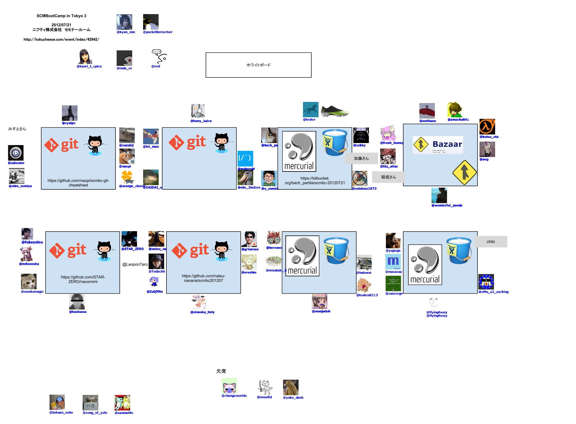 2012年7月21日(土)に東京は新宿にあるニフティのセミナールームで『SCMBootCamp in Tokyo 3』が開催されたので、それに参加してきました。 SCMBootCamp in Tokyo 3 #scmbc http://kokucheese.com/event/index/42642/ そもそも、この手の勉強会に参加するのは初めてだったので結構緊張していたのですが…。 あれ?向こう側のテーブルにみすとさんそっくりな人が見えるよ?そんなところで何やってるん?というかニフティのスタッフさんとか言われてるよ? 会場がニフティとか言う時点で、なんとなく予感めいたものはあったのですが、でもその反面、まさかそんなはずはないよねー、などとも思っていたのですが、正真正銘のみすとさんだったのでした。 閑話休題。 今回はGit、Mercurial、Bazaarの3種類から1つを選んでのハンズオン演習を行うということで、私は「Bazaar」を選択していました。もともと、最近少しDVCSを勉強し始めていて、Gitはその過程で少し触ってた、Mercurialは触ったことはないけど聞いたことはある、「Bazaar?何それ聞いたことない。よしこれにしよう」というノリでBazaarに決定した次第です。 それにしても、Bazaarは、 でも講師担当の方が1グループに2人つくことになってお得感倍増でした。 午前中の最初は『入門Mercurial』の著者でもある藤原さん(@flyingfoozy さん)による基調講演で、「世代差で見る履歴管理ツール入門」。 資料「世代差で見る履歴管理ツール入門」 http://www.lares.dti.ne.jp/~foozy/fujiguruma/scm/scmbc-201207/speech.html 興味深かったのは、Git, Mercurial, Bazaarでは「ブランチ」についての考え方?が違っているらしく、まったく同じ「ブランチ」という言葉を使っているのに全然話が通じないという『バベルの塔(改)』状態になることもあるのだそう。SCMBCのスタッフ会議でも紛糾するらしいです。 『パターンによるソフトウェア構成管理』とかいう本も勧められました。機会があったらちょっと読んでみましょうかね。 その後、各グループごとにツール(Git、Mercurial、Bazaar)の環境設定を確認して午前の部は終了。 お昼ご飯はお弁当が準備されてました。何種類か準備されてて早い者勝ち。私は炊き込みご飯のお弁当。 午後は3回ほどの時間帯に分けてハンズオン演習でした。演習内容は、各チームの使うツール(私のところならBazaar)のチートシートを、チームメンバーで共同して作成していくというもの。 私のチームでは、Markdownと呼ばれるマークアップ形式(?)のテキストでチームメンバーが共同で原稿を作成していき、講師役の稲田さん(@methane さん)がそれをHTMLに変換、といった感じ。 三段組になっているのは、Twitter BootstrapというTwitter謹製のCSSフレームワークを使っていてお手軽にできるらしい。 Bazaarスタートアップガイド (http://standing-shoebill.appspot.com/bzr-startup-guide/solo.html) を参考にして次々と試していきました。基本的な作業は以下の通り。